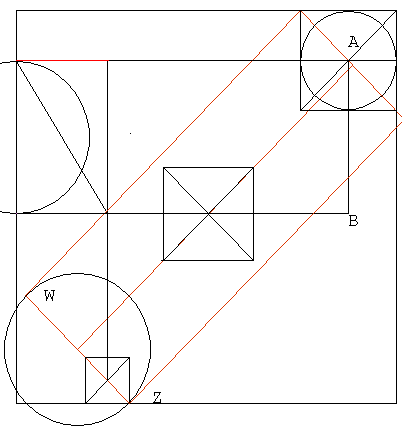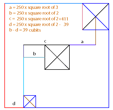17The channel axis 'd' between the two diagonal simulations (lines 'c' and 'e' in the diag), runs 0.0001 cubit, 0.003 inch, or 0.07 mm southwest of the diagonal given by Petrie.. It is truly identical to Petrie's diagonal. The line 'c' is a dual purpose line; it combines with yet another major line to pinpoint the vertical axis of G2. *** A Repeat of the Column Substitution Idea - the Second Pyramid's Center Located The Golden Column substituted for the Rising Column lets us duplicate the Great Pyramid as specified by Petrie. Now, the same trick works in reverse! The Rising Column in its final form suspended from the the top line of the Golden Column, falls 0.94 inch south of the second pyramid's horizontal axis (cyan in the diagram below). This line simulates the axis nicely, but its true purpose is different. It meets line 'c', the Diagonal Simulation #2, 14/10,000", 35/1,000 millimeter, or 7/100,000 cubit east of Petrie's vertical axis. Those are mighty fine specs. Considering the size of our work-space, Giza, expecting this kind of results would be far from realistic. diag.18 The axis and the diagonal together locate G2's center a pinpoint away from Petrie's plan, at 0.005 inch (1/200"), 0.13 millimeter, or 0.00025 cubit. We know the position of G2's southern side to 4 millimeters since the very beginning; therefore, the Second Pyramid can be recreated with impressive accuracy even before its final adjustment. An alternative exact way of reconstructing the Second Pyramid's NW-SE diagonal Having two or more perfectly adequate ways of accomplishing the same task is a pure luxury, yet it is a reoccurring motif in our reconstruction. It is clearly systematic. ![]() The big red circle in the diagram is actually double, with centers in both the #2 and #3 versions of G3: From the pyramid-center of each version, draw a circle through the SW corner of the Golden Column. Each circle seems tangential to the same axis of G2. In fact, both come close. G3 #2 version - the circle is 0.8286 inch short of the axis, while in G3 #3 version - the circle is 0.8163 inch past the axis. The axis line of this channel is 0.006 inch, 0.0003 cubit, or 0.16 millimeter to the southwest of the original G2 axis given by Petrie. Since we already have a point just 4 millimeters above the south side of the Second Pyramid, the pyramid can be completed as the initial Second Pyramid. Its sides will be over 8 millimeters shorter than the true pyramid, extremely close, but still not perfect. Its center and diagonals are ideal, however. the Third Pyramid - Final adjustments Having the initial Second Pyramid permits testing Legon's ideas in our settings. The size of the pyramid is determined by using the point (x) from diagrams 4 and 6, a little over 4 millimeters closer to the center. 1: The east-west distance between the west sides of the Second and Third Pyramids equals 250√2 cubits. This postulate locates the west side of the Third Pyramid 0.006 cubit (3.45 millimeters) west of Petrie's version. 2: The east-west distance between the center of the Second Pyramid and the west side of the Third Pyramid equals 250√2 + 205.5. This postulate works even better, locating the west side of the Third Pyramid 0.003 cubit (1.5 millimeters) west of Petrie's version 3: Counting 250√2 + 411 cubits westward from the east side of the Second Pyramid does finally locate the west side of the Third Pyramid, as it locates its SW corner 0.0014 cubit (0. 5175 millimeter) east of Petrie's specification. The other corner of the south side is given with an even greater precision, hence the Third Pyramid stands recreated exactly as given by Petrie. (This formula also works nicely for Legon's reconstruction - to 0.01 cubit (5.4 millimeters) east of Petrie's version.) Diagram 194: Working with the Pyramid Square confers an opportunity to note another Legon-style formula for the reconstruction. Draw line 'd' eastwards from the SW corner of the Pyramid-Square to the length of 250√2. Then subtract 39 cubits from it. The new segment ends 3.32 millimeters west of the Petrie's SW corner of G3. Segments 'b' and 'd' have a horizontal overlap of 0.00026 cubit, 0.005 inch, or 0.13 millimeter! This is more support for the validity of both the Pyramid Square concept and Legon's observations. We have counted five accurate ways to deploy an exact formula using 250√2 towards locating the SW corner of the Third Pyramid. So which solution should we use? The fact is that there are at once five accurate solutions for the west side of the Third Pyramid, or its SW corner. All are accurate - since Petrie's points come with a ± radius. We may think of those points as small circles, and all five solutions fall inside those circles. Multiple solutions designed into the Giza puzzle show off its sophistication. We shall never learn, which version was the one actually implemented on the ground. the Second Pyramid - Final Adjustment Draw a line 250√3 , or 433.0127.. cubits long westwards from the vertical axis of the duplicated Great Pyramid. Make this the distance to the east side of the Second Pyramid. The fault from Petrie's version then is 0.00126 cubit, or 0.66 millimeter. Since the center of this pyramid is already located with utmost precision, the adjusted Second Pyramid is identical in size to that given by Petrie. Conclusion: Petrie's layout of the great pyramids of Giza can be accurately recreated from scratch on a clean slate, beginning with the '13-Step' construction of the regular 5-pointed star from a line segment, with some involvement of the basic prime number square root values. The method has simplicity, total accuracy, elegance, and intellectual depth. With such attributes, it must be essentially identical to the actual procedure of planning the Giza layout. It is noteworthy that the method does not work with the classical tools of geometry, at least not without a microscope. Given the scale of Giza, and the tiny differences between drawing object