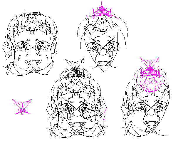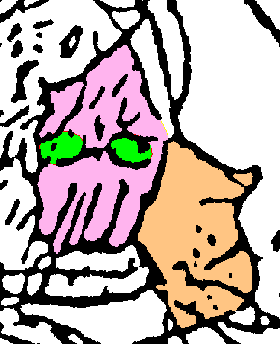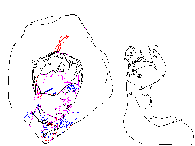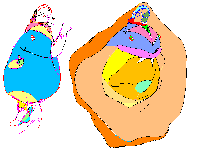 A smaller Pinocchio like face appears at the back of the head of the first profile ... Pinocchio's head is enclosed in a transparent helmet. His orientation puts him into sync with the booted feet, in contrast with the main face. Since there are the boots, and the transparent helmet held by angular attachments to the bulbous, symmetric cloak or habit - could the cloak portray a suit of armor or a spacesuit? There is yet another vista available here. Imagine the bulbous suit as a steep hill. Is that a castle at the hilltop?