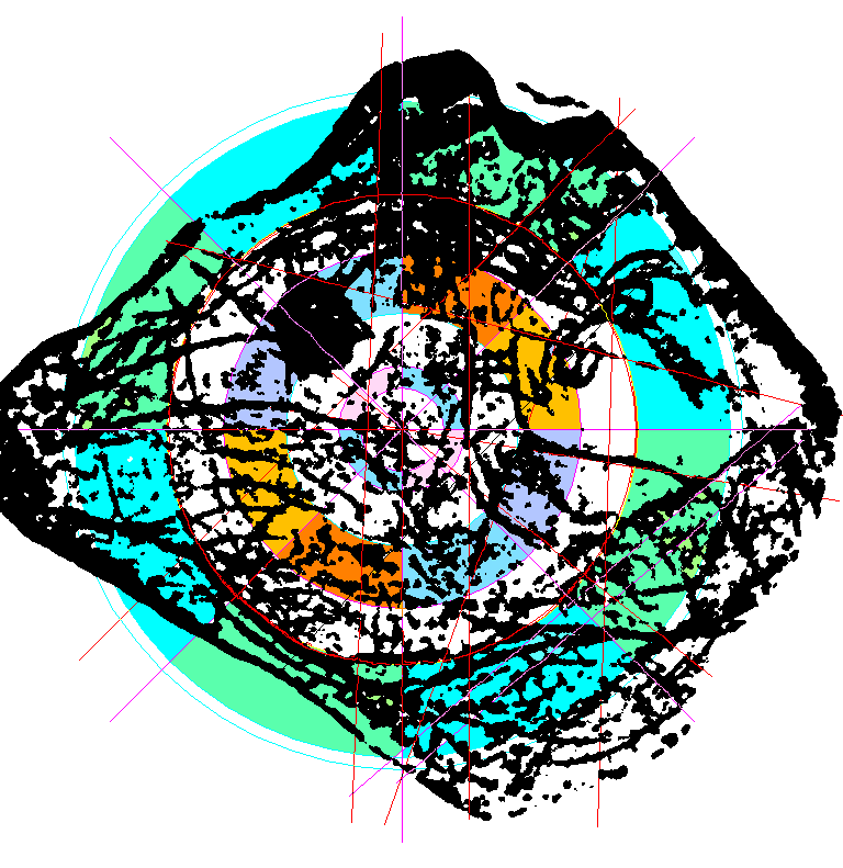 Those Grossly Obese Cave-Women Without HeadsBy my estimate, the consensus is that this image is another Palimpsest. Again, an intricately woven image from La Marche is being dismissed as inextricably entangled scribbles! As in a number of other cases, the main motif is supposedly a crudely rngraved rotund Venus without a head. One shudders at the fact that most Venuses from the site are headless! Before La Marche, Venuses, all with the head on, had been exclusive to the much earlier Gravettian Period. More engravings of headless females, however, were unearthed at Gonnensdorf, Germany, 4,000 years younger than La Marche.No doubt, headless Venuses are features of the La Marche engravings, but never the main, or lone interpretation. To reduce so much to so little would be too simple-minded. This particular engraving affects me as one harmonious whole, a masterpiece. The vista is dominated by an apparition of a regular circle visible from all angles. A pair of compasses proves that the circle is true; a true circle fits the engraved lines really well (diagram). A quick Reality Check: a) A circle is a circle. It is a real symbol of itself. It cannot be misinterpreted as itself. b) But, as a symbol of other things, the circle is transcendental, metaphorical, and subject to interpretation. This complex image really gets my imagination