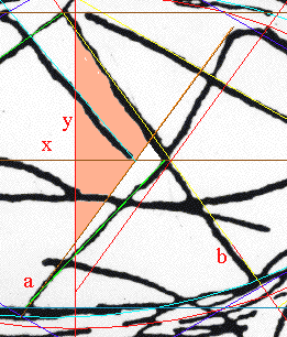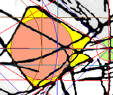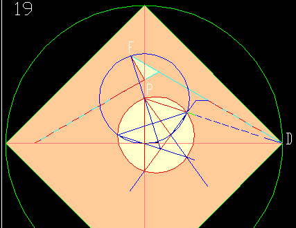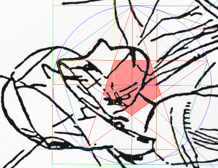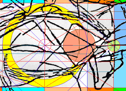 Section in process within the Square. The big circle is one of the four such possible circles (one for each quadrant), and it definitely fits the engraving, in at least 12-points. We refer to it as the 12-point circle. Concentrical with the 12-point circle, is the small brown circle in the diagram below. Its diameter forms the Golden ratio with the diameter of the Golden circle itself, as seen from the star in the diagram above. Like the 12-point circle, this small circle also fits the image neatly. |