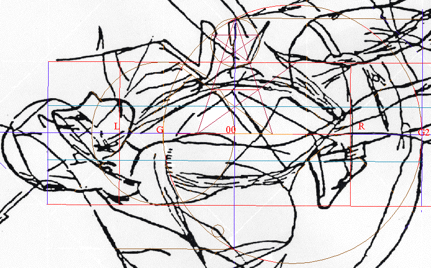 The big circle in the diagram below divides the horizontal diagonal in the Phi ratio, and gets us the radius of the Golden Circle, It is centered at the 3/4 point of the square's horizontal diagonal, and passes through two corners of the square. segment 00 - R / seg. G - 00 = seg. G - 00 / seg. L - G = 1.6180339887.. = Phi The torso's width is well contained within the band of the Golden Rectangle's width (the height of the Golden circle). This is clearly visible. |